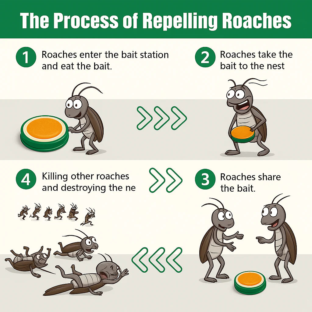A single cockroach infects others, creating a powerful domino effect that wipes out the entire colony, including egg nests.